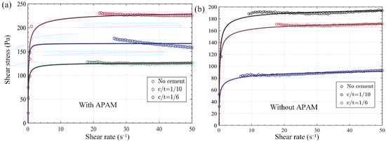 It can be observed from both Figure 10a,b that the shear stress was higher for slurry with cement added than for slurry without cement added, which is most likely caused by more hydration products in specimens with cement added. Moreover, under the same condition of c/t ratio, the shear stress was also higher for slurry with APAM than for slurry without APAM. Above all, adding flocculants and cement would make the slurry difficult to shear and make its fluidity worse. Moreover, the negative effects of the two on fluidity did not conflict, which can make the slurry more difficult to shear [21]. According to the research results of Jiang et al. [1], the zeta potential of the cement particles and hydration products decreased because of the addition of APAM, leading to the weakening of repulsive force and subsequently showing worse flow behavior, which corresponded to the test results.