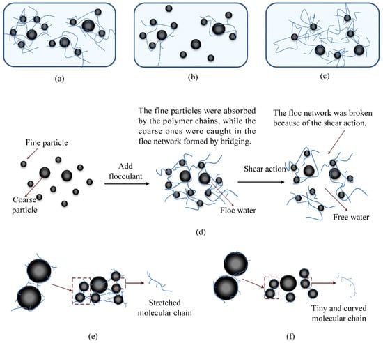 - As shown in Figure 11a, the dosage of flocculants was less at a low additive ratio, and there were still some free fine particles in the slurry that were not captured by polymer molecules or captured particles with adsorbed vacancies. Because there were few polymer molecules objectively, the particles bridged by polymer molecular chains were also very limited, resulting in loose floc structure and less floc water formed. With the increase in flocculants addition, as shown in Figure 11b, all the fine particles in the slurry could be adsorbed completely, and there were no extra adsorption vacancies on the particles at the reasonable additive ratio. At this time, the polymer molecular chain could bridge the fine particles in the slurry to the greatest extent, and the formed floc structure was the most stable, which could wrap more water. If the dosage of flocculants continued to increase, as shown in Figure 11c, there would be no free fine particles in the slurry. The polymer molecules tended to adsorb the remaining vacancies of the originally attached particles, and only a few polymer molecules adsorbed vacancies on other particles outward. As a result, the bridging effect of polymer chains was weakened, resulting in a relatively loose flocculant network structure and less floc water formed by wrapping [15,25];