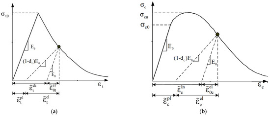The damage plasticity model developed by Lee and Fenves [29] is extensively used in concrete definition, which has been incorporated into the software of ABAQUS. In this model, the failure of concrete can be divided into tension cracking and compression crushing, and two isotropic damage coefficients are introduced to describe the stiffness degradation of concrete. Figure 2 presents the damage plasticity model of concrete in uniaxial tension and uniaxial compression, respectively. In conditions of uniaxial tension, the stress–strain curve grows linear before reaching the tensile strength. Then, strain-softening occurs, and the tensile stiffness degrades. In conditions of uniaxial compression, the stress–strain curve is linear before reaching the proportional limit, then the plastic strain starts to develop, and the compressive stiffness begins to degrade. The relationship between stress and strain under uniaxial loading is defined by Equations (1) and (2) [29], in which, , and represent the damage coefficient, the total strain, and plastic strain under axial tension, respectively. Similarly, the subscript c in the symbol represents the variables under axial compression.