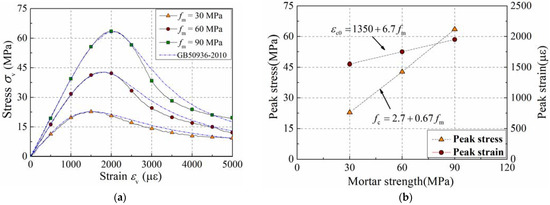 Figure 3b presents the strength relationship between concrete and mortar by analyzing the peak values of these curves. This figure indicates that both peak strain and peak stress of concrete are linearly related to the strength of the mortar phase, and the strength relationship is presented in Equation (5).