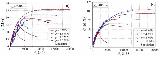 In this section, the numerical model of concrete with different strengths was established. The proposed model was efficient in describing the compressive stress–strain curve of unconfined concrete. Based on this model, it is valuable to study the dilation property of concrete in active confinement by applying the confining pressure.