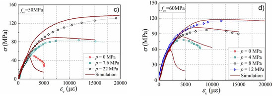 Comparison of the stress–strain curves between simulation and test results. (a) fco = 35.8 MPa; (b) fco = 40 MPa; (c) fco = 50 MPa; (d) fco = 60 MPa.