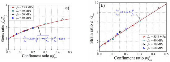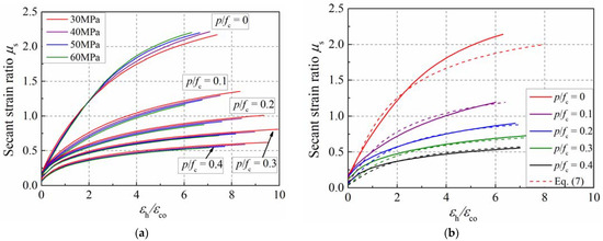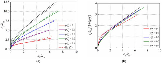 Figure 16a presents the lateral–axial strain curves of concrete cylinders with varying confinement ratios. The dotted lines with colors of red, purple, blue, green and black in Figure 16a represent the equation results for the specimens with confinement ratios of 0, 0.1, 0.2, 0.3 and 0.4, respectively. According to the study in the literature [13], the following expression was adopted to describe the lateral–axial strain relationship of concrete in active confinement, as presented by Equation (8).