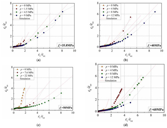 Comparison of the lateral–axial strain curves between simulation and test results. (a) fco = 35.8 MPa; (b) fco = 40 MPa; (c) fco = 50 MPa; (d) fco = 60 MPa.