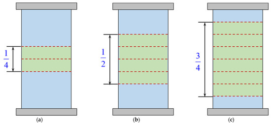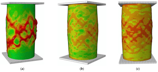 Generally, the distribution of the lateral strain along the circumference and the height of the specimen is not uniform when compressive failure occurs in concrete. Therefore, great discreteness exists in the strain measurement in the tests. In order to reduce the influence of discreteness, the average strain was used in the analysis of the simulation results. Specifically, the lateral strain at each section is the average of 100 points along the circumferential direction, and the average strain at several sections can be regarded as the specimen’s lateral strain. Considering that the failure of the concrete cylinder with no or low confinement ratio was prone to local damage, while the failure of the specimen with a high confinement ratio was relatively uniform, the difference was considered in the current study when obtaining the average value. By trial and error and comparing with the test data, the authors observed that if 3, 5, and 7 sections were selected for the specimens with low (0 or 0.1), middle (0.2), and high (0.3 or 0.4) confinement ratios, respectively, presented in Figure 10, the simulation would produce a satisfactory estimation. The zone proportions were 1/4, 1/2, and 3/4 of the specimen height, and the average values were approximately 0.97, 0.90, and 0.78 of the maximum value in the middle section.