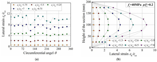 Figure 9a presents the distribution of the lateral strain in the middle section (1/2 height). It can be observed that the lateral strain is uniformly distributed in a circumferential direction as the axial strain ratio, , is set as 1.75 or 3.5. Nevertheless, the distribution of the lateral strain begins to become non-uniform as the axial strain ratio, , exceeds 5.25. The peak strain of the confined concrete is about 4.5 times that of plain concrete when the confinement ratio is set as 0.2 according to Equation (5), namely, . Thus, it can be concluded that the transverse dilation of concrete is not uniformly distributed as the axial strain exceeds the peak strain of confined concrete. A similar phenomenon was also observed in plain concrete in our previous work [39]. Figure 9b describes the development of lateral strain along the longitudinal direction; the concrete’s strength is 40 MPa and the confinement ratio is set as 0.2. It can be observed that the lateral strain is not uniformly distributed along the specimen’s height, which is almost in a sinusoidal form.
