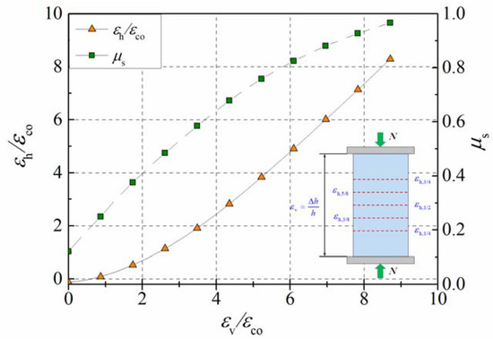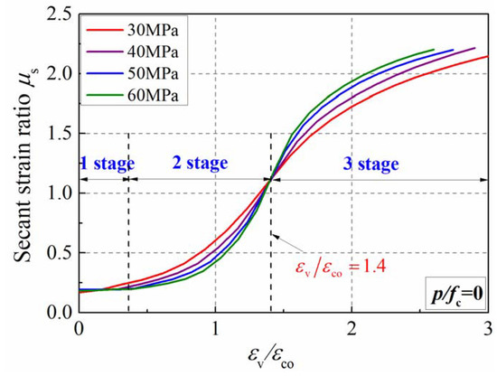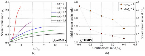 The influence of the confinement ratio on the dilation of the specimen with different strengths is similar. Figure 14a presents the simulation results of the concrete specimen with a strength of 40 MPa. With the increase in the confinement ratio, the transverse dilation is inhibited, and then the secant strain ratio slowly develops. Figure 14b presents the influence of the confinement ratio on the secant strain ratio at zero strain and 3εco. When the axial strain is three times the peak strain of plain concrete, the secant strain ratio is 2.25, 0.81, 0.54, 0.40, and 0.25 as the confinement ratio is set as 0, 0.1, 0.2, 0.3, and 0.4, respectively. Moreover, the initial secant strain ratio is 0.177, 0.156, 0.130, 0.113, and 0.070 when the confinement ratio increases from 0 to 0.4, illustrating that the confining pressure can inhibit the development of the secant strain ratio. The analysis indicates that the confinement ratio is an important parameter affecting the transverse dilation of concrete, which should be considered in the formula.