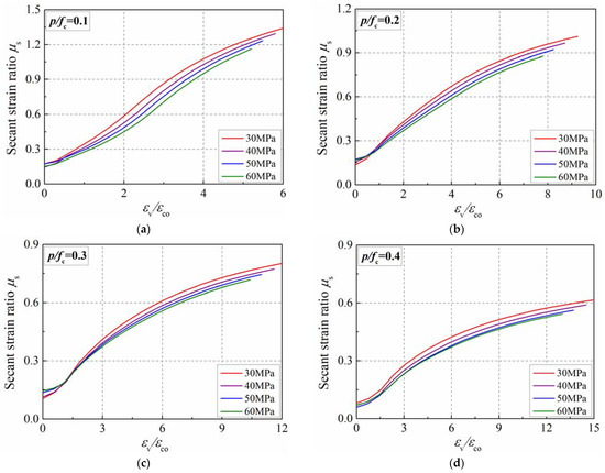 Influence of strength grade on secant strain ratio of concrete in active confinement. (a) p/fc = 0.1; (b) p/fc = 0.2; (c) p/fc = 0.3; (d) p/fc = 0.4.