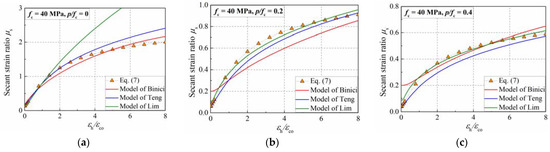 Secant strain ratio prediction of the proposed and existing formulas. (a) p/fc = 0; (b) p/fc = 0.2; (c) p/fc = 0.4.