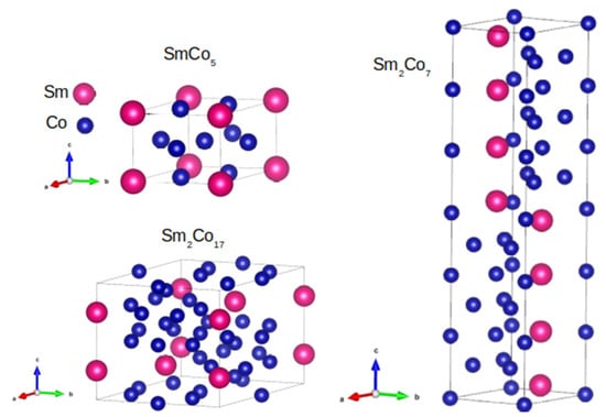 RE-Co phases: The hard magnetic RE-Fe-B compounds reveal relatively low Curie temperatures of approximately 380 °C, which limits the application of these materials at high-temperatures. The substitution of Fe by Co in many compounds and alloys leads to a remarkable increase in the Curie point. For example, well-known Sm-Co systems [,,,] such as SmCo5 (hexagonal structure, P6/mmm), Sm2Co7 (hexagonal structure, P6/mmc), and Sm2Co17 (rhombohedral structure, P6/mmc) are important. The adequate crystal structures of these systems are presented in Figure 2. The magnetic order of the presented Sm-Co structures is ferromagnetic, with the easy magnetization axis placed along the c direction. Generally, conventional (bulk and powder) Sm-Co compounds are good high-temperature permanent magnets, but they have a lower energy product |BH|max than Nd-Fe-B and a similar coercivity (not exceeding 1.2 T). Focusing on materials with ultra-high coercivity, the Sm2Co7 compound was obtained by applying the so-called hot deformation, for which the coercive field reached the value of approximately 5 T [].