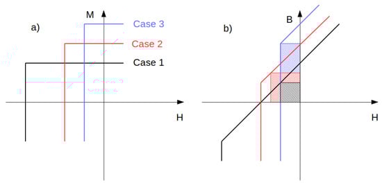 Impact of increasing the soft magnetic components on the M(H) and B(H) characteristics (see the text). The areas of crossed rectangles indicate the |BH|max parameters. (a) The M(H) curve (b) The B(H) curve.