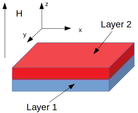 The considered systems (3D in space) consist of 40 x 40 x 40 nodes, equally spaced at a distance of 1 nm. Some nodes are attributed to the hard magnetic phase and the others to the soft, as shown in Figure 6. The bilayer system was chosen in order to simulate strong exchange coupling between the magnetically hard (blue in Figure 6) and soft (red in Figure 6) phases. The layers are infinite in the x-y plane (with periodic boundary conditions of 40 x 40 x 40 nodes per system) and a different size in the z-direction in order to set different phase compositions (a percentage ratio of “layer 2” to “layer 1”) in the range of 0–85%. In particular, the following systems (hard layer 1–soft layer 2) were considered: Tb2Fe14B–Fe, Nd2Fe14B–Fe, SmCo5-Fe, FePt–Fe, FeCo–Fe, and MnBi–Fe. Additionally, the Tb2Fe14B–SmCo5, Tb2Fe14B–FePt, Nd2Fe14B–SmCo5, and Nd2Fe14B–FePt bilayer systems were analyzed.