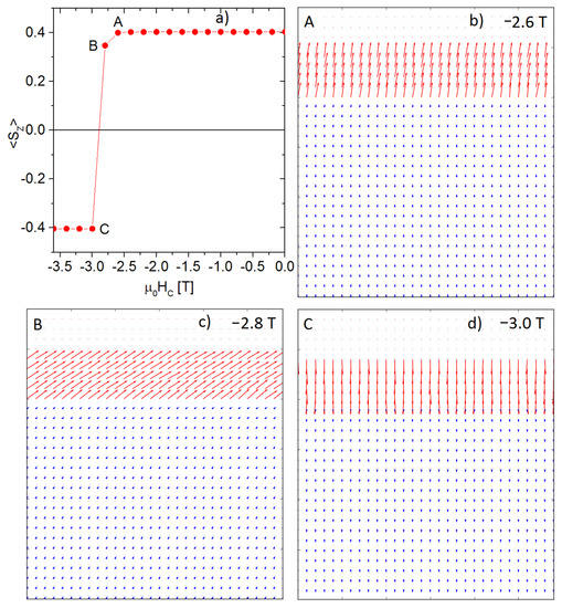 The main results of the carried-out simulations are the reverse magnetization curves, from which it is possible to determine remanence, coercivity, and the |BH|max parameter. An example, the curve for Tb2Fe14B-Fe (20% Fe) is shown in Figure 7a. The rapid reverse magnetization at the coercive field is related to the assumed simplification that the external field is placed parallel to the direction of magnetic anisotropy. Figure 7b,c depicts the spin configurations for the different external fields around coercivity.