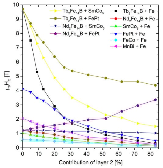 The maximum is not observed for the FeCo-Fe composite due to the decrease in magnetic saturation with the increasing Fe contribution. If the composite contains two hard magnetic phases, then the |BH|max parameter varies monotonically. Excluding the economic aspect, some systems without or with a reduced RE content will fill the gap between Nd-based and classical permanent magnets, i.e., between 50 and 400 kJ/m3. The special importance of ultra-high coercive phases as a part of the spring-exchange composite should be emphasized because the values of the |BH|max in the gap range occur for a much smaller RE contribution. In the case of Tb2Fe14B-Fe, FePt-Fe, and FeCo-Fe composites with 80% Fe, these are still good permanent magnets. It is interesting to compare the predicted and experimental enhancement of the |BH|max for the studied cases. One can indicate a relatively good agreement for the MnBi-Fe system (simulations revealed an enhancement of approximately 1.6 times, i.e., from 99 kJ/m3 to 160 kJ/m3). As reported in [], for the MnBi-Fe multilayer system, the |BH|max varied from 100 kJ/m3 to 140 kJ/m3, which gives a satisfactory compatibility with the results of the presented simulations. Another experimentally studied thin layer system is SmCo-Co [], for which a 30% increase in the |BH|max was reported. The simulations indicated that this value in the level of 47%, accounting for simplifications of the model, can be a confirmation of the correctness of the modeling assumptions. The obtained result of the |BH|max enhancement for the Nd-Fe-B/Fe system (theoretically, approximately 10%) seems to be surprising. In this case, the coercivity decay is “faster” than the increase in remanence, which is the main reason for such an effect. In fact, there is no information in the literature reporting significant progress in applying the spring-exchange mechanism to this type of system. For other examined cases, it is hard to perform such a comparison due to difficulties in obtaining a pure L10 phase, as well as in assuming the theoretical values of the anisotropy constants in the simulations. The Tb-Fe-B/Fe system has not been experimentally tested. However, in case of Tb-Fe-B/Y-Fe-B alloys, the |BH|max enhancement reached a value of approximately 300% [].