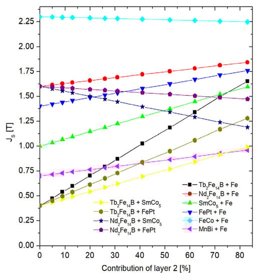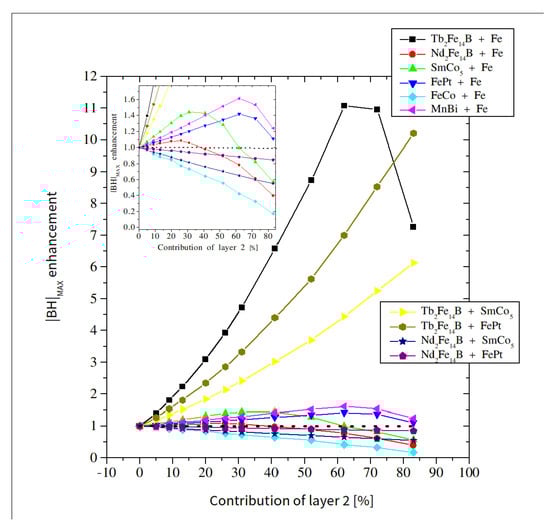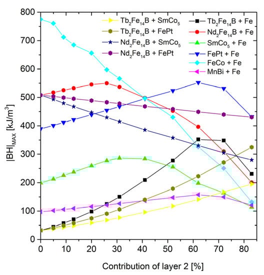 Figure 8 shows a collection of coercivities in a function of the composite composition for all the examined cases. A general tendency to decrease the Hc with an increasing contribution of the magnetically soft (or softer) components can be observed. The strongest coercivity decay is observed for the system of Tb2Fe14B-Fe. However, for 60% of Fe, the coercive field still exceeds 1 T. The dependence of the Hc vs. the soft phase content is rather exponential, ranging from coercivity of the hard phase to coercivity of the soft phase. Obviously, the strongest coercivity decay is observed and expected with the largest difference in the Hc between these phases. The increase in the content of the soft component causes a linear change in the saturation magnetization and, consequently, the magnetic remanence, as shown in Figure 9. The remanence and coercivity are parameters that strongly influence the |BH|max. In the case of the analyzed systems, the increase in the contribution of the soft phase with a high saturation level causes an increase in the residual magnetization and, simultaneously, a decrease in the coercive field. The first tendency leads to an increase in the |BH|max, while the second acts in the opposite direction. Finally, the optimal composition of the composite should be observed. Figure 10 and Figure 11 show the dependence of the content “layer 2” (mainly soft phase) on the |BH|max and the relative change of this parameter (in relation to the pure hard phase), respectively. In some cases, a maximum |BH|max occurs, and the corresponding values of the |BH|max, enhancement of the |BH|max, and the “layer 2” contents are shown in Table 3.