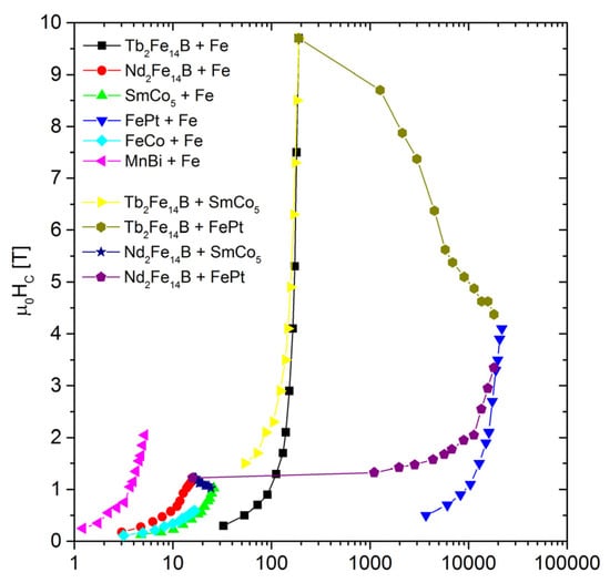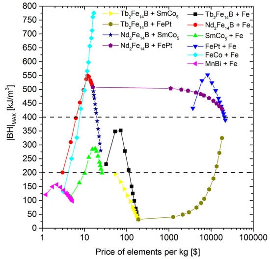 Unfortunately, the mentioned composites are expensive due to the high price of Tb and, especially, Pt. The data received should be collected as a function of the average price of the elements. Figure 12 shows such a function for the |BH|max parameter. One can see that only Nd2Fe14B-Fe, SmCo5-Fe, MnBi-Fe, and FeCo-Fe fill the gap, with prices of below 10 USD/kg. Figure 13 presents the cost aspect of coercivity. As shown, ultra-high coercivity can be obtained only for systems with Tb2Fe14B and FePt. The cost of a composite with a coercivity of more than 3T is over 100 USD/kg (for Tb2Fe14B) and 1000 USD/kg (for FePt).