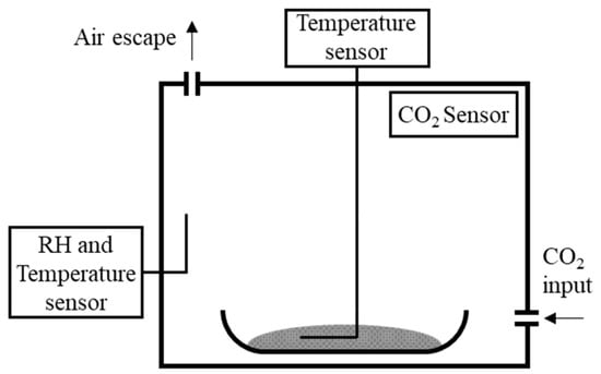The carbonation process used in each parametric analysis was performed using an airtight chamber (Figure 1) with a volume of ≈87 liters. In each carbonation test, 100 g of CPP were exposed to the pre-defined CO2 concentration (CO2c) for 2 h. CO2c was monitored over time, as well as the RH, temperature of the atmosphere (initially set at 60% and 20 °C, respectively), and temperature of the CPP.