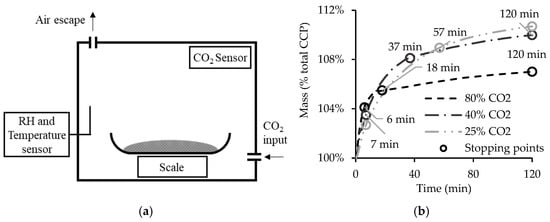 Equipment setup for the mass growth analysis (a) and the mass growth of CPP and stopping points considered during the carbonation process (b).