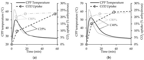 This Section analyses the influence of the CO2 concentration inside the chamber’s atmosphere (CO2c) on CO2 uptake and CPP temperature. Figure 4 presents the first hour of the carbonation tests for C25%, C40%, and C80% (standing for CO2c of 25%, 40%, and 80%, respectively). All the curves present near-steady behaviour during the second hour; for this reason, this period was not included. C25% and C40% are included in Figure 4a,b, respectively, along with the C80% curves [23] in both figures (grey lines) for easier comparison. The results indicate similar behaviour for each CO2 concentration, with a much higher carbonation rate phase before 2SP than after this point, as previously observed for C80%. As expected, the carbonation rate before 1SP decreases with the CO2 concentration, presenting CO2 uptake values at this point of 10%, 15%, and 20% for C25%, C40%, and C80%, respectively. However, by the time process reaches 2SP, the three CO2 concentrations present similar CO2 uptake values, between 22% and 24%, suggesting a carbonation threshold at this point. This result can be explained by the depletion of calcium-bearing compounds other than C-S-H in CPP, promoting deceleration of the carbonation reaction rate [23]. In fact, after 2SP, among these calcium bearing compounds only C-S-H remains active in the carbonation reaction. Therefore, this point defines the minimum necessary resident time for the waste material under forced carbonation of a continuous industrial process. Note that from 2SP until the end of the process, C25% and C80% present a CO2 uptake rate of 0.020%/min, while C40% presents a slightly higher value of 0.026%/min. The different CO2 concentrations existing in the chamber had little influence on the carbonation rate of C-S-H, and, therefore the CO2 uptake, after 2SP. At the end of the carbonation test, C40% reported the highest CO2 uptake at 25.8%, followed by C80% and C25% with 24.5% and 23.7%, respectively. Even though C40% presented the best carbonation performance, the variation between C40% and the worst performer (C25%) was only 2.1%. This small difference should be considered when assessing the impact on energy efficiency of the carbonation process in an industrial context, especially if flue gas is considered as a prospective source of CO2.