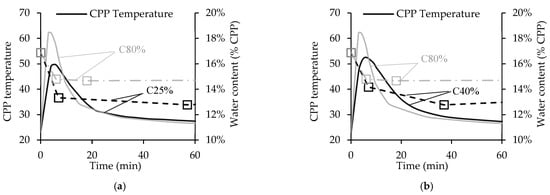 Figure 5 is similar to Figure 4, although showing the water content with CPP temperature. The three tested CO2c samples presented similar behaviour throughout the carbonation process, displaying a sharp water content reduction in the first few minutes (before 1SP). After this drop, water reduction was not significant, especially in the second phase of the carbonation process (after 2SP). Results suggest a close relationship between the variation of the water content and the CPP temperature, both in terms of temperature peak (and rising rate) and in terms of temperature descending rate. This is visible in the smoothest descending rate of C40%, which can explain the progressive water content reduction between 1SP and 2SP instead of the water content stabilization shown in C80%. Moreover, the relationship between water content (Figure 5) and CO2 uptake (Figure 4) is only visible until 1SP (the higher the CO2 uptake, the higher the water content); after this point, another mechanism seems to apply, as the water content tends to stabilize at a higher value in C80% (14.8%) than in C25% and C40% (13.5% and 13.3%, respectively).