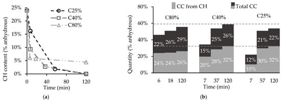 Figure 6 presents the CH content for each CO2 concentration (Figure 6a) and the discrimination between the obtained from CH and from other calcium-bearing compounds (Figure 6b) using data provided by TGA. These results show that both C40% and C25% are able to consume all of the CH, unlike C80%, which was unsuccessful in carbonating all the existing CH. Moreover, Figure 6a shows that for C80%, the originating from CH remains nearly constant after 1SP, indicating that almost all of the carbon-accessible CH is consumed within the first 6 min. This very rapid and intense reaction supports the high heat burst at the beginning as well as the formation of a dense coating around the CH particles. This is commonly called the shield effect, which blocks further carbonation of CH [19,26,27]. Conversely, for C40% and C25% the CH is able to carbonate throughout the process (Figure 6), leading to longer heat release (Figure 5), which is continuously reduced by thermodynamic equilibrium with the lower chamber temperature. Thus, for lower CO2c, these results suggest a possible higher precipitation of away from the CH particle surface and the consequent reduction of the blocking effect caused by the dense coating. This result reveals a positive prospect for more complete CH carbonation in CO2 poorer atmospheres.
