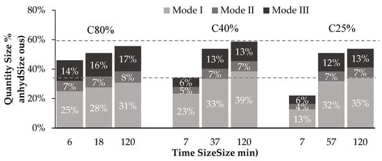 A comparison between Figure 6b and Figure 7 confirms that obtained from CH is primarily related with from Mode I for the three CO2c, as discussed below. In C40% and C25%, from Mode I is always slightly higher than from CH (differences between 2% and 7%), from CH increases over time following the progressive carbonation of CH (Figure 6a), and the less stable compounds (e.g., aragonite, vaterite and ACC) are prone to progressive crystallization into the highly crystalline detected in Mode I [31,34], justifying the previously mentioned difference. Regarding C80%, the behaviour is similar with the exception of the stabilization of from CH after 1SP, which is explained by the corresponding trend presented by CH (Figure 6a). These results point to the high degree of crystallinity (and thermodynamic stability) in obtained from CH.