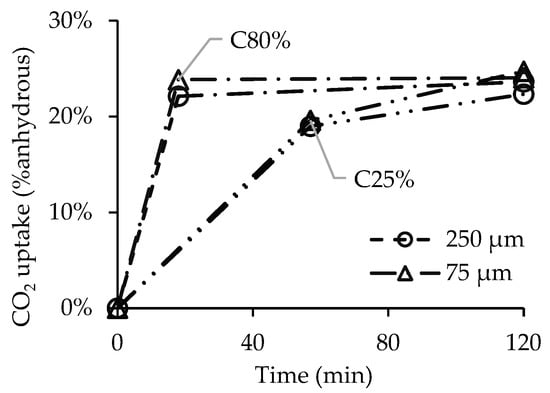 Figure 9 shows the CO2 uptake during the carbonation process for C80% and C25% for the different particle sizes. A preliminary analysis reveals that the results are seemingly similar, as reduction in the maximum particle size presents a limited effect on the enhancement of the CPP carbonation degree after the two-hour carbonation process. The carbonation rate is high until 2SP and much slower after that point, while CO2 uptake stabilizes between 22–25%.