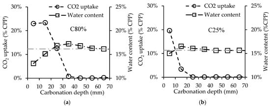 Figure 10 presents the in-depth carbonation of a 70 mm thick CPP powder layer for C80% (a) and C25% (b) and the corresponding water content inside the sample. In the two-hour carbonation test, C80% was able to carbonate 15 mm of CPP, while C25% was limited to the first 5 mm. This result is significant, as C80% was able to carbonate twice the depth of C25%, thus allowing for higher carbonation efficiency.