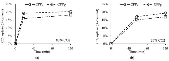 CO2 uptake over time for CPPc and CPPp for CO2 carbonation of 80% (a) and 25% (b).