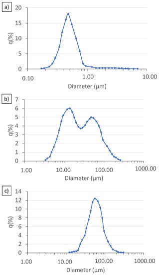 Then, as a result of laser particle size measurement, a distribution was obtained, which represents the volume percentage of individual fractions with a given particle diameter of Al2O3, Ni and Ti in the total volume of powders. Figure 3a–c show the results obtained. The average particle size of the alumina powder (Figure 3a) obtained during the test is equal to 0.61 µm, and the median is 0.48 µm. The particle diameter range of PSD distribution is very wide, ranging from 0.17 µm to 7.69 µm. The most abundant fraction of 17.24% of the powder volume are particles with a diameter of 0.51 µm. The obtained results differ from the average particle size declared by the manufacturer. This is due to the fact that alumina powder is prone to form an agglomerate formation, which has been confirmed by SEM observations. Figure 3b shows the results for the nickel powder. The mean particle size of the nickel powder obtained during the test is 35.888 µm and the median 22.86 µm. The particle diameter range of the PSD distribution is bimodal and ranges from 3.41 µm to 262.38 µm. The analysis revealed the presence of two powder fractions ranging from 3.409 µm to 26.11 µm and from 26.11 µm to 262.38 µm. In the case of the first fraction, the particles with a diameter of 13.25 µm represent the largest batch of 6.005% of the powder volume. In the case of the second fraction, the largest batch of 4.98% of the powder volume are particles with a diameter of 51.47 µm. The obtained results differ slightly from the mean particle size declared by the manufacturer < 50 µm. The test shows that the average particle size of the nickel particles is about 35 µm, however, there are also particles larger than 50 µm. Figure 3c shows the results for the titanium powder. The mean particle size of the titanium powder obtained during the test is 57.89 µm, and the median is 53.46 µm. The particle diameter range of the PSD distribution is wide, ranging from 11.57 µm to 262.38 µm. The most abundant fraction of 12.40% of the powder volume are particles with a diameter of 58.95 µm.