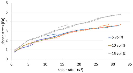 The next step was to focus on rheological research. The obtained results for the suspensions were presented in the form of collective diagrams showing the flow curves (Figure 5) and the viscosity curves (Figure 6). Based on the flow curves shown in Figure 5, it can be concluded that all suspensions are thixotropic fluids, as evidenced by the hysteresis loops visible in the curves. Moreover, all the suspensions have low yield points, less than 1.5 Pa.