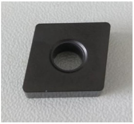 Before micro-texturing the substrate surface, the TiAlN-coated tool was first ultrasonically cleaned in acetone and then in alcohol for 30 min (the blade used in the experiment is shown in Figure 1). Figure 2 shows the SEM and EDS diagrams of the TiAlN coating and WC/Co substrate (a and b are the SEM and EDS diagrams of WC/Co substrate, and c and d are the SEM and EDS diagrams of TiAlN coating). In WC/Co cemented carbide, WC has high hardness, Co has good toughness, and the contact angle between WC and Co is zero. Therefore, wettability is excellent, and the liquid phase sintering can be realized at low temperatures [30].