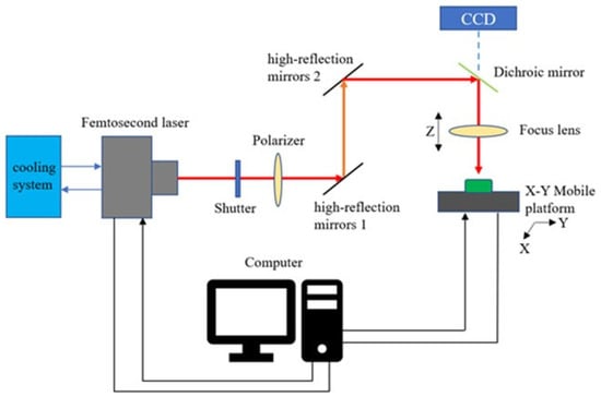 The femtosecond laser uses self-mode-locking technology to compress the pulse width to the femtosecond level to realize the processing of materials so that the action time of the femtosecond laser and materials is far less than the expansion time of plasma [25]. Therefore, it can avoid the occurrence of the plasma shielding phenomenon and effectively improve the processing efficiency. The femtosecond laser has recently been widely used in tool coating micro-texture processing due to its superior machining characteristics.