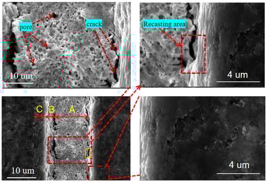 Figure 4 shows the micro-texture morphology of the TiAlN-coated tool surface processed by a femtosecond laser when the laser pulse energy is 10 μJ, the scanning speed is 1 mm/s, the number of scans is 3, and the repetition frequency is 40 kHz. The figure that the microgroove texture morphology formed by laser processing can be divided into three different affected areas. The microstructure inside the micro-texture presents a molten structure with a large number of pores, which is a deep ablation area (zone A). Among them, the pores are formed by the explosion of the liquid phase caused by the laser shock [31], as well as the plasma and high-speed gas flow generated by gasification. The molten-like structure is formed by condensing molten droplets that are not sputtered out of the groove in time. When the pressure caused by the laser beam is higher than the surface tension of the tool coating, the melt is sputtered out and condenses in a very short time, creating areas of material recast (zone B) at the edges of the micro-texture. The modified area (zone C) is next to the material recasting area. Although there is no apparent macroscopic morphology change in this area due to the strong Coulomb repulsion, the positive ions ejected after the material cluster explode due to the interrelationship. The formation of larger particles that fail to agglomerate results in the microscopic morphology exhibiting a compact nanoparticle-like morphology.