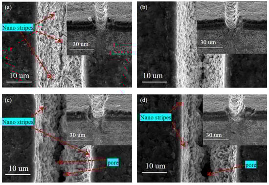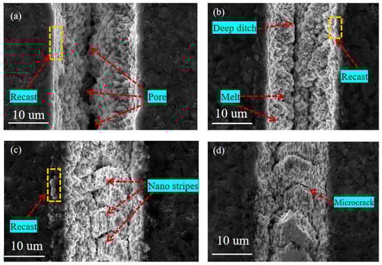 As shown in Figure 7, SEM images of the surface morphology of micro-textures were processed under different laser energy (E) at a scanning speed of 0.7 mm/s, a scanning time of 1, and a repetition rate of 40 kHz. It can be seen from the figure that when the laser energy is small (E = 5 μJ and E = 10 μJ), the microgroove morphology is complete, and the nano-stripe structure can be observed (Figure 7a,b). When the laser energy is increased to 15 μJ and 20 μJ, the energy density at the center of the spot is higher, so the laser energy absorbed by the coating tool material per unit volume is also increased accordingly. The high energy density causes the melting of nano-stripes, and the nano-stripes in the molten state form aggregate under the action of surface tension, which leads to the collapse of the nano-stripe structure at the center of the groove and the formation of large holes. Nano-stripes still exist on both sides of the groove due to low energy (Figure 7c,d). At the same time, the plasma wave caused by high energy density tends to produce a reverse impact, resulting in instability in laser processing and ultimately leading to the unevenness of the machine microgroove edge. Therefore, in the femtosecond laser processing of the TiAlN-coated tool micro-texture, the groove surface morphology is more precise and more regular when the smaller energy (5 μJ or 10 μJ) is selected.