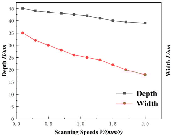 The equivalent pulse number is NV = F/V. When the repetition frequency F of the pulsed laser is constant, the NV is only related to the laser scanning speed. The higher the scanning speed, the lower the laser spot overlap ratio and the fewer laser equivalent pulses (as shown in Figure 9). When the scanning speed is too low, the energy deposited on the unit area is too large, so that the liquid phase in the molten pool cannot be sputtered in time; it thus deposits inside the groove, causing blockage. When the scanning speed increases to a certain extent, the coincidence frequency of the light spot is low, the number of pulses deposited on the unit area is small, and the energy is low, resulting in the shallow depth of the microgroove. The depth and width of the microgroove texture changing with the scanning speed are shown in Figure 10.