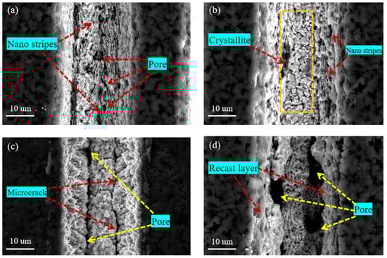 Figure 11 shows the SEM images of the micro-texture morphology machines on the surface of the coated tool under different scanning times when the laser energy is 10 μJ, the scanning speed is 0.7 mm/s, and the repetition rate is 40 kHz. It can be seen that when the number of laser scanning is 1 (Figure 11a), the accumulated energy per unit area is insufficient to form apparent groove morphology due to the less absorbed laser energy in the processing area. The groove depth is shallow, the groove boundary is fuzzy, and there are nano stripe structures and pores at the bottom of the groove. When the scanning time increased to 3 (Figure 11b), the microcrystals at the bottom of the groove were observed, the edge of the groove was fuzzy, and the nano-stripe structure was generated.