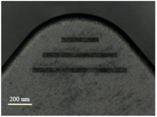 When the laser pulse energy is 10 μJ, the scanning speed is 0.7 mm/s, the number of scans is 5, and the repetition rate is 40 kHz; the cross-section morphology of the groove structure is shown in Figure 5. It can be seen from the figure that the morphology of the groove is relatively straightforward, there is less molten material in the groove, and there is no significant recast layer produced on the edge of the groove. Moreover, it can be observed that the bonding between the coating and the substrate is good, and the laser at the edge of the groove has caused minor damage to the bonding of the coating and the substrate. Figure 6 shows the microgroove texture morphology when the laser pulse energy is 25 μJ, the scanning speed is 2 mm/s, the scanning time is 1, and the repetition rate is 40 kHz. It can be seen from the figure that due to the high energy of the femtosecond laser and the excessively fast scanning speed, the coatings on both sides of the micro-grooves are severely damaged, and the morphology of the micro-grooves is of poor quality. There is a melting in the micro-grooves, which causes the groove to be blocked.
