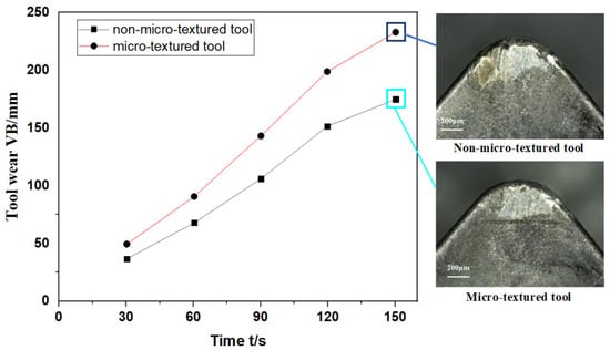The value of flank wear varies with cutting time, and the images of different cutting tools after machining for 150s are shown in Figure 13. The flank wear value of inserts with micro-grooved texture decreased significantly by around 25%. It can be found from the figure that the maximum wear amount of the rake face of the tool with micro-grooved texture is significantly lower than that of the tool without micro-texture, and the wear degree of the top edge of the micro-textured blade is significantly reduced. In the cutting process, the temperature gradient and stress gradient near the contact surface between the tool tip and the workpiece are higher, so there is a significant shear of stress in this area. However, compared with the tool without micro-texture, due to the existence of a micro-grooved texture, the stress concentration of the micro-texture tool tends to the microgroove texture area, which slows down the stress concentration at the edge of the tooltip and plays a role in protecting the tool. In addition, the existence of the micro-texture also reduces the actual contact area between the tool surface and the chip, thereby reducing the average shear strength of the rake face and improving the friction condition of the contact area of the rake face.