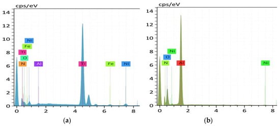 In order to further explore the wear mechanism of the microgroove texture on the tool, an energy dispersive spectrometer (EDS) was used to analyze the specific area. Figure 14 shows the SEM images of the microgroove textured tool before and after cutting, and Figure 15 shows the energy spectrum analysis of the areas on both sides of the microgroove (A) and the internal area of the microgroove (B). It can be seen from Figure 14 that adhesive wear is another factor that influences tool wear. The adhesion on the tool surface can be observed from Figure 14b, and the adhesion in the inner area of the groove is smaller than that in the areas on both sides of the groove. The nickel content in the area without microgrooves is significantly higher than in the areas with microgrooves, indicating that the microgrooves can effectively reduce the bond wear of the tool.