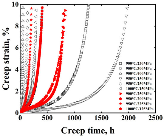 Creep curves obtained under different conditions for MarM247LC superalloy. The black curves were used for fitting the Larson–Miller parameter and training the model; the red ones were used to validate the model.