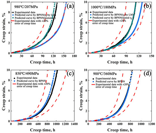 On the other hand, the creep curves of DZ125 and CMSX-4 superalloys have been collected for the BPNN model with the same structure for training [12,13]. The creep curves of DZ125 superalloy under 900 °C/350 MPa, 950 °C/225 MPa, 950 °C/370 MPa, 980 °C/220 MPa, 1040 °C/137 MPa, and 1050 °C/102 MPa were trained and 980 °C/207 MPa and 1000 °C/180 MPa were tested. For CMSX-4 superalloy, the creep curves under 850 °C/430 MPa, 850 °C/560 MPa, 900 °C/400 MPa, 900 °C/460 MPa, 950 °C/250 MPa and 1000 °C/180 MPa were trained and 850 °C/490 MPa and 900 °C/360 MPa were tested. The predicted curves were compared with the experimental data for the two superalloys, as shown in Figure 3. As seen, the maximum prediction errors of the BPNN model are within ±20% for the two superalloys indicating that this method is suitable for different types of superalloys.