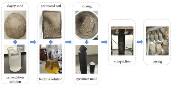 For the UCS test, cylindrical specimens with a diameter of 50 mm and a height of 50 mm were prepared. Figure 2 illustrates the preparation procedure for the UCS specimen. Firstly, the inner wall of the mold was coated with petroleum jelly to prevent the CLS from sticking to the mold. Secondly, the pretreated CLS was mixed with the bacteria solution and then filled in the mold. The CLS mixture was compacted until two blocks were pressed into both the sides of the mold. Finally, the compacted specimens were demoulded and then cured in a biological incubator at 30 °C within different curing times before further tests.