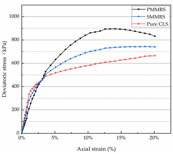 Figure 5 presents the shear response for the PMMRS, SMMRS and pure CLS specimens under a fixed stress of 100 kPa. For the UU test, the PMMRS specimens were prepared with the optimum parameters determined by the orthogonal experiment, and the pure CLS specimens were prepared with the same moisture content of 9%. As shown in Figure 5, the deviatoric stress for the MICP reinforced specimen was obviously greater than the pure CLS at the same axial strain, and the peak deviatoric stress increased with the increase in reinforcement effect. In addition, there were difference in the shear responses among the PMMRS, SMMRS and pure CLS specimens. For the PMMRS specimen, the deviatoric stress initially increased with the axial strain and then tended to decrease after reaching the peak deviatoric stress. From this point of view, the strain–shear pressure response of PMMRS could be considered as strain softening. Moreover, the corresponding response for the pure CLS was strain hardening. The deviatoric stress continually increased with the axial strain, and there was no peak stress appearing. For the SMMRS specimens, the strain–shear pressure response was between strain hardening and strain softening. The reason for this phenomenon might be the influence of MICP reinforcement effect. Montoya [39] found that the stress–strain response of specimens transitioned from strain hardening to strain softening with the MICP reinforcement effect. According to the results in Section 3.2, the MICP reinforcement effect of PMMRS was superior to SMMRS. Therefore, the stress–strain response of PMMRS was strain hardening, and the response of SMMRS was between strain hardening and strain softening.