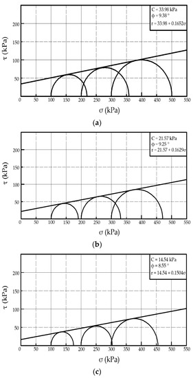 The Shear strength envelope for the PMMRS, SMMRS and pure CLS were obtained (Figure 6). The friction angle for the PMMRS, SMMRS and pure CLS specimens were 9.38°, 9.25° and 8.55°, while the cohesion values were 33.98 kPa, 21.57 kPa and 14.54 kPa, respectively. As published by Mingjuan Cui [40] and Ivanov Volodymyr [41], the reinforcement mechanism of MICP on the soil can be summarized as two types of principles: bio-clogging and bio-cementation. On the one hand, the CaCO3 crystals attach on the soil particles and improve the surface roughness, which increases the friction angle of the soil. On the other side, the CaCO3 crystals may bond soil particles together and hence improve the cohesion of the soil. Compared with the pure CLS, the cohesion of PMMRS and SMMRS showed a significant improvement while the friction angle increased by only 0.83° and 0.7°, respectively. It can be concluded that the bio-cementation principle mainly contributes to reinforcement effect for the mixing MICP method. Furthermore, both the friction angle and cohesion of PMMRS were greater than SMMRS, which also indicated that the pretreatment procedure could improve the reinforcement effect of the mixing MICP method.