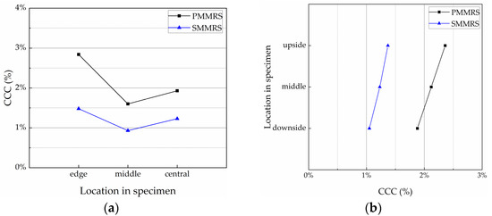 There is no doubt that the reinforcement effect of MICP on the soil is strongly dependent on the amount and distribution of CaCO3 generated. In fact, it is really a great challenge that CaCO3 is generated unevenly in the specimen, no matter the laboratory experiment or the field test [14]. Figure 7 presents the CaCO3 content (CCC) test results of PMMRS and SMMRS in different sampling locations, which was described in Section 2.5.3. The CCC of PMMRS was greater than SMMPRS, while there was obvious difference in the CCC for different locations of both PMMRS and SMMRS specimens.