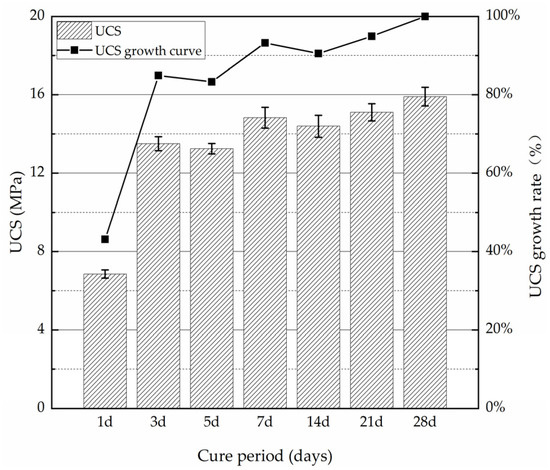 In order to study the strength development of PMMRS, specimens were prepared and cured in a microbial incubator at 30 °C for 1, 3, 5, 7, 14, 21 and 28 days, respectively. After the specimens were dried at 105 °C for 24 h, they were subjected to UCS testing. The UCS growth rate was defined and calculated by Equation (11). The UCS and UCS growth rate for the PMMRS specimens within different curing periods are shown in Figure 10.