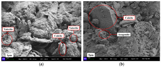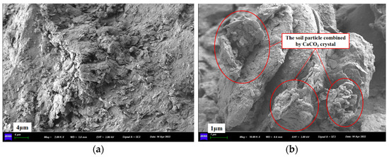 Figure 12 and Figure 13 are the FESEM images for the pure CLS and the PMMRS specimens, respectively. For the pure CLS, small soil particles gathered and formed on the big particles in Figure 12a. As shown in Figure 12b, CaCO3 crystals were easily observed for the PMMRS specimen. Firstly, CaCO3 crystals could bond the little soil particles together and thus increases the cohesion of the CLS. Moreover, some CaCO3 crystals were attached to the surface of soil particles, which improves the internal friction between the soil particles. Therefore, the PMMRS specimens showed greater cohesion and friction angle than the pure CLS and hence contributes to greater strength, which was in accordance with the results of UCS and UU tests. Moreover, Figure 13 illustrates that three CaCO3 crystals, including calcite, aragonite and vaterite, were generated in PMMRS, which showed obvious differences in the morphology features. This was in accordance with the results in Section 3.6. The rules for CaCO3 generation and the effect mechanism on PMMRS are needed to be seriously clarified from the micro structural point of view in the future study.