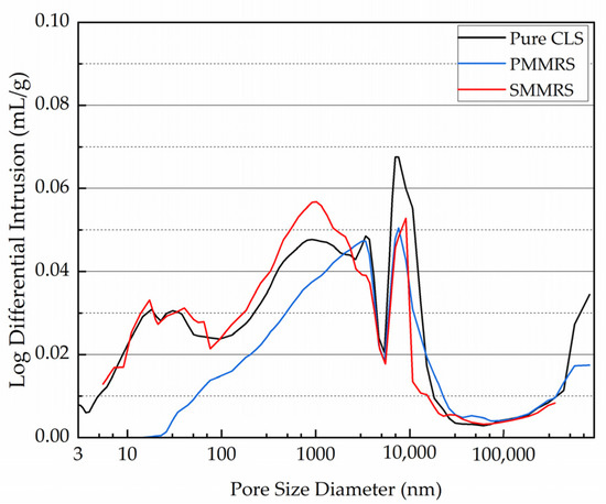 The MIA test results are shown in Figure 14 and Figure 15. As shown in Figure 14, for the small pore size, the pore volumes of the PMMRS and SMMRS were less than the pure CLS, while the results for the large pore size were the opposite. Figure 15 presents that PMMSR had the highest average pore diameter but lowest calculated porosity, while pure CLS did the opposite.
