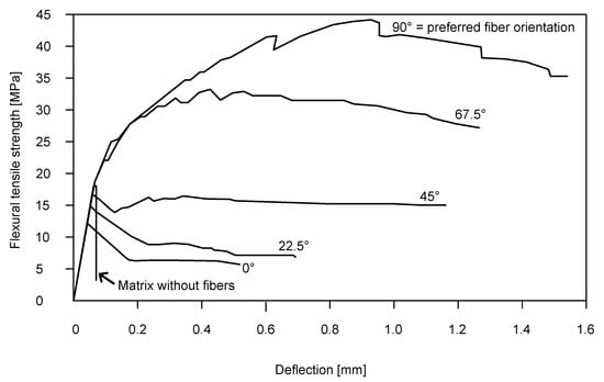 The elastic modulus, compressive strength on cylinders and cubes and simple tensile strength on dogbones were tested on the specimens. The modulus of elasticity was measured on the cylinders with a diameter of 150 mm and a height of 300 mm. The tensile strength was tested on specimens where a tensile crack occurred in a part of a rectangular cross-section of 50 × 100 mm according to [31]. In this specimen, according to [32], a size effect could be significant for UHPC because the specimen thickness was only 50 mm in the middle part where the crack occurred. Dispersed reinforcement in small specimens tends to be parallel to the formwork and the surface planes, and in this narrow part, fibres would be more in the longitudinal direction. The angle measured between the dispersed reinforcement and the specimen axis significantly affects measured tensile strength as shown in Figure 1. Therefore, only mixtures without dispersed reinforcement were tested by this method.